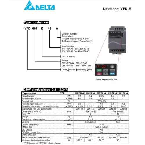 VFD022E21A : Delta E Series, 2.2kw/3hp,